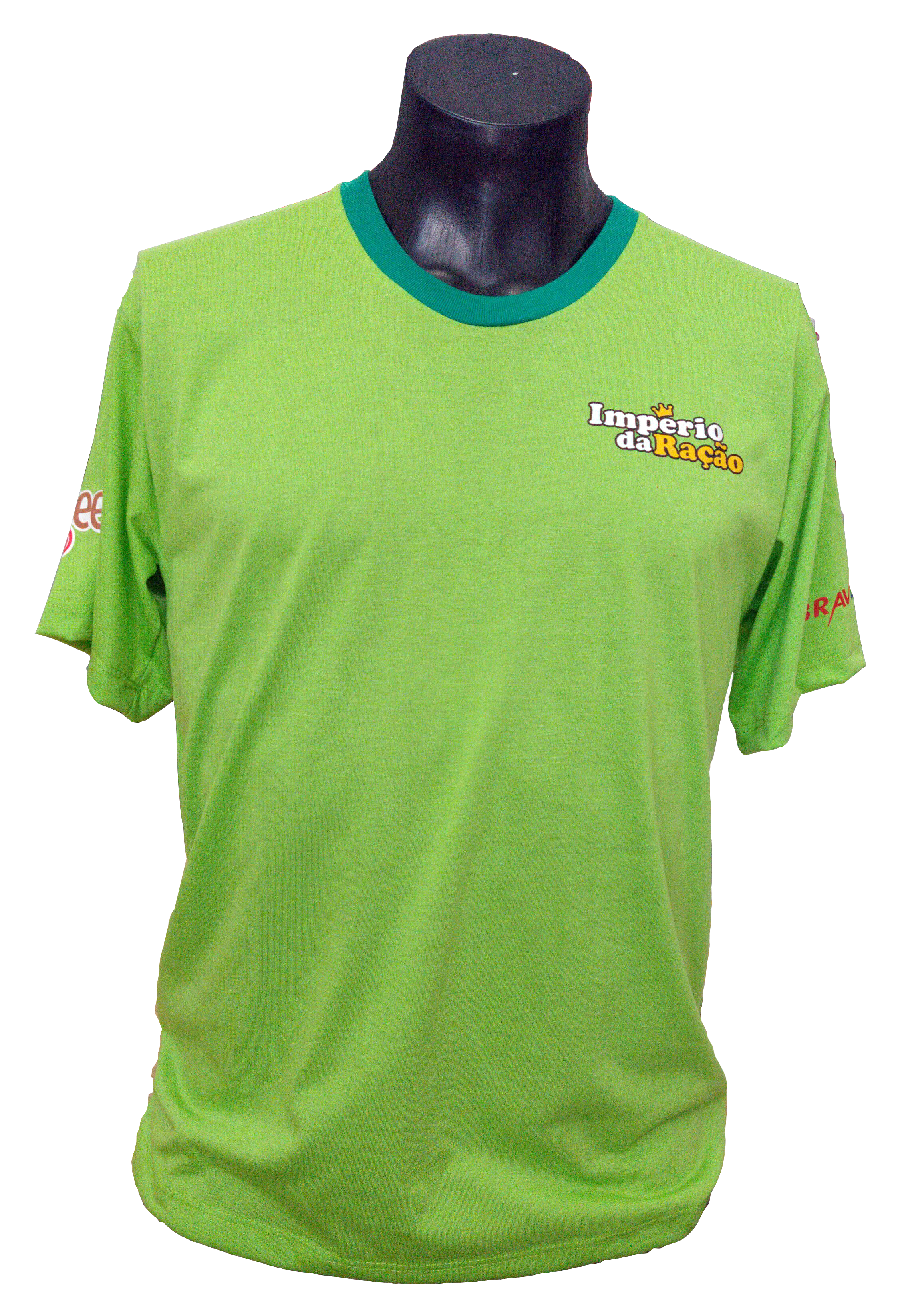 2) Camisas em PV, modelo gola redonda, nas cores verde limão e vermelho, de manga curta